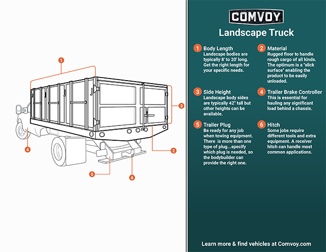 The landscape dump truck, in its many configurations, is a commercial vehicle expressly built to haul heavy loads of loose material, such as mulch and loam, while also carrying lawn care equipment, in both standard and dovetail landscape truck models. Featuring a partially-enclosed cargo bay with hinge-mounted doors, and a hydraulic lift to offload loose material, the landscape truck is ideal for any lawn care or landscaping business, either growing or established.